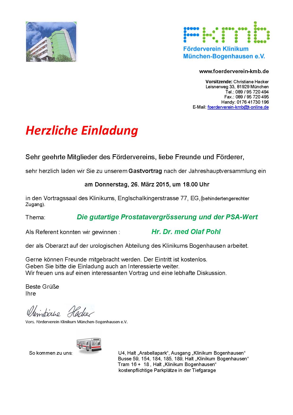 >> Veranstaltungen Vorschau: Samstag, 04. Juni 2016, ab 09.00 Uhr unser traditioneller Flohmarkt auf dem Parkplatz des Klinikums fällt aus _____________________________________________________________________________________ Donnerstag, 20. Oktober 2016, ab 18.00 bis 20:00 Uhr Vortrag im Hörsaal, Einladung folgt _____________________________________________________________________________________ Sonntag, 20. November 2016, 10.00 bis 17.00 Uhr Im Foyer des Klinikum Bogenhausen, Englschalkingerstrasse 77, EG Adventsbasar im Klinikum Bogenhausen _____________________________________________________________________________________ Donnerstag, 24. November 2016, ab 18.00 bis 20:00 Uhr Vortrag von CA Prof. Dr. med. Christoph Dodt über das neue Notfallzentrum im Hörsaal, Einladung folgt _____________________________________________________________________________________ Rückschau: Donnerstag, 14. April 2016, um 17.30 bis 19:30 Uhr Jahreshauptversammlung mit Wahl, anschließend Vortrag zur Neubauplanung des Klinikums REFERENT: Dr. Thomas Krössin wurde in den Oktober 2016 verschoben _____________________________________________________________________________________ Sonntag, den 13. März, von 10.00 bis 17.00 Uhr. Im Foyer des Klinikum Bogenhausen, Englschalkingerstrasse 77, EG Osterbasar im Klinikum Bogenhausen _____________________________________________________________________________________ Sonntag, 22. November 2015, 10.00 Uhr bis 17.00 Uhr Im Foyer des Klinikum Bogenhausen, Englschalkingerstrasse 77, EG Adventsbasar im Klinikum Bogenhausen _____________________________________________________________________________________ Donnerstag, 25. Juni 2015, 18.00 Uhr „Dick ist nicht gleich dick. Übergewicht bei Frauen und Männern“ oder „Der Bauch kommt selten allein!“ Im Vortragssaal des Klinikums, Englschalkingerstrasse 77, EG Ost, (behindertengerechter Zugang) ein. _____________________________________________________________________________________ Samstag, 20. Juni 2015, ab 09.00 Uhr unser traditioneller Flohmarkt auf dem Parkplatz des Klinikums _____________________________________________________________________________________ Mittwoch, 10. Juni 2015, um 17.00 bis 18.30 Uhr Ersten kostenlosen Training zur Sturzprophylaxe im Klinikum Bogenhausen, Erdgeschoss West, Raum 314a _____________________________________________________________________________________ Konzert Donnerstag, 30. April 2015, von 17.30h bis 19.00h Im Personal-Restaurant zu kommen, Englschalkingerstrasse 77, EG Ost, (behindertengerechter Zugang) ein. Fröhlichkeit und Leichtigkeit der Musik von Klassik bis POP des Golden Brass Ensemble _____________________________________________________________________________________ Donnerstag, 26. März 2015, um 17.00 Uhr Im Vortragssaal des Klinikums, Englschalkingerstrasse 77, EG Ost, (behindertengerechter Zugang) ein. Jahreshauptversammlung _____________________________________________________________________________________ Donnerstag, 26. März 2015, um 18.00 Uhr Im Vortragssaal des Klinikums, Englschalkingerstrasse 77, EG Ost, (behindertengerechter Zugang) ein. Thema: Die gutartige Prostatavergrösserung und der PSA-Wert Referent: Hr. Dr. med Olaf Pohl der als Oberarzt in der urologischen Abteilung des Klinikums Bogenhausen näheres hier _____________________________________________________________________________________ Sonntag, den 22. März, von 10.00 bis 17.00 Uhr. Im Foyer des Klinikum Bogenhausen, Englschalkingerstrasse 77, EG Osterbasar im Klinikum Bogenhausen _____________________________________________________________________________________ Samstag, den 15. November, von 10.00 bis 17.00 Uhr. Der Förderverein unterstützt diese Veranstaltung und lädt Sie deshalb herzlich ein Medizin erleben - Tag der offenen Tür im Klinikum Bogenhausen